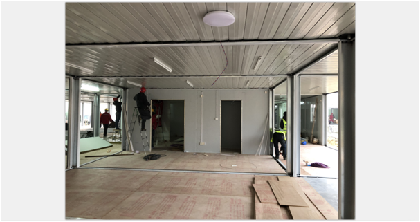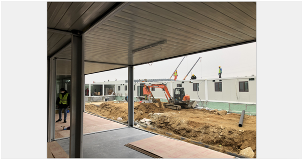 收到配合威海建設(shè)集團(tuán)完成打包式廂房的建設(shè)指令后,磊升建設(shè)立馬部署,連夜論證施工方案,緊急召集安裝工人140余人,于2月3日進(jìn)場(chǎng)施工,輪流倒班、24小時(shí)搶工,至2月8日完成 400套打包式廂房的制作安裝,到2月11日,完成約8000平方米鋼結(jié)構(gòu)雨蓬的安裝,克服重重困難,為威海市防疫工作添磚加瓦。