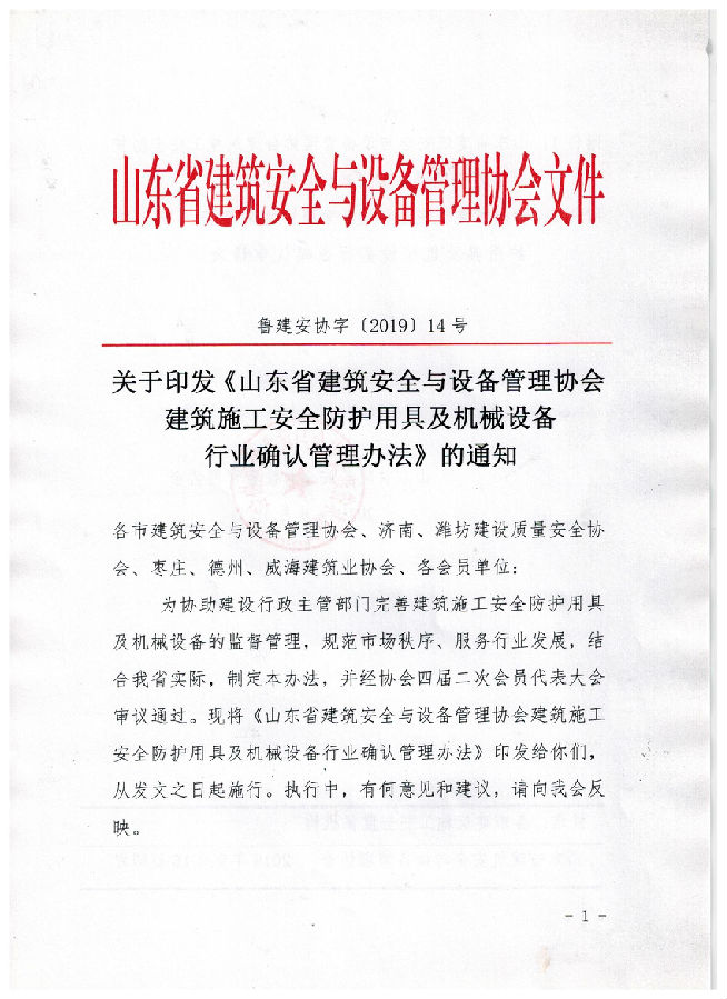 轉(zhuǎn)發(fā)山東省建筑安全與設(shè)備管理協(xié)會關(guān)于印發(fā)《山東省建筑安全與設(shè)備管理協(xié)會建筑施工安全防護用具及機械設(shè)備行業(yè)確認管理辦法》的通知