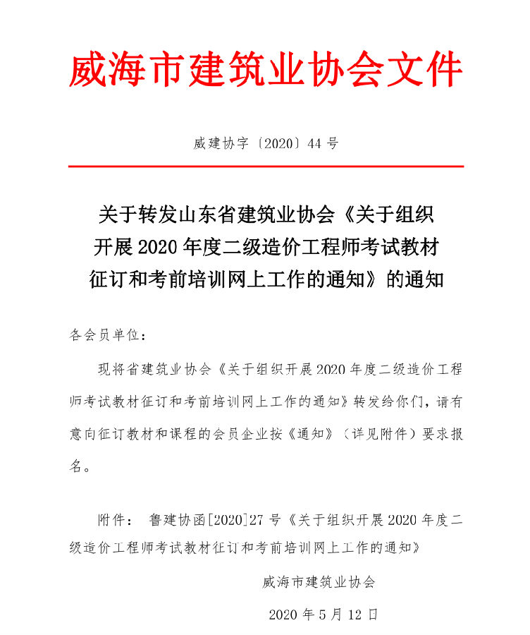 • 當(dāng)前位置:首頁(yè) >文件公告>關(guān)于轉(zhuǎn)發(fā)山東省建筑業(yè)協(xié)會(huì)《關(guān)于組織 開展2020年度二級(jí)造價(jià)工程師考試教材 征訂和考前培訓(xùn)網(wǎng)上工作的通知》的通知