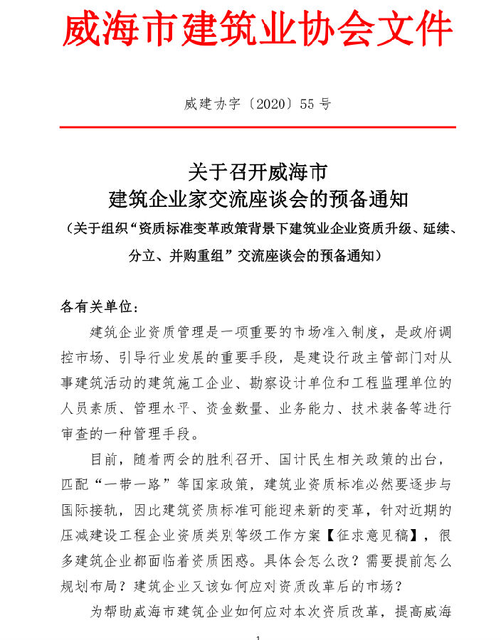 關(guān)于召開威海市建筑企業(yè)家交流座談會(huì)的預(yù)備通知