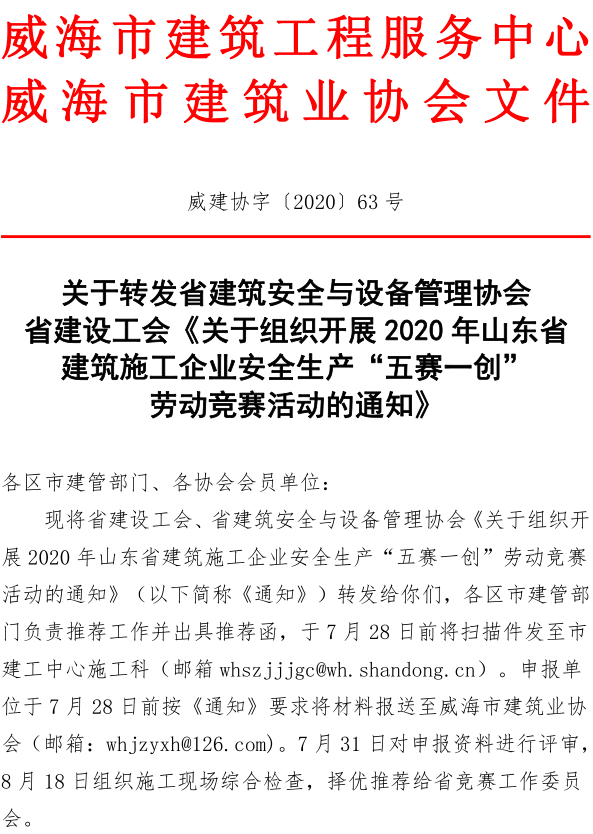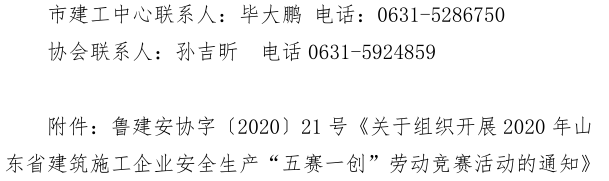 關于轉(zhuǎn)發(fā)省建筑安全與設備管理協(xié)會 省建設工會《關于組織開展2020年山東省 建筑施工企業(yè)安全生產(chǎn)“五賽一創(chuàng)” 勞動競賽活動的通知》