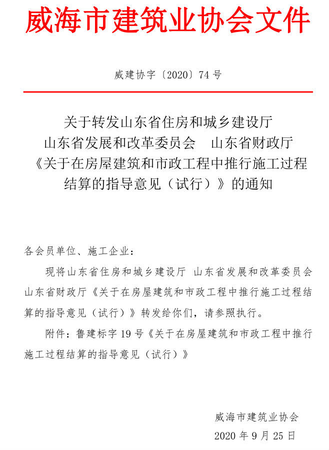 關(guān)于轉(zhuǎn)發(fā)山東省住房和城鄉(xiāng)建設(shè)廳 山東省發(fā)展和改革委員會 山東省財(cái)政廳 《關(guān)于在房屋建筑和市政工程中推行施工過程結(jié)算的指導(dǎo)意見(試行)》的通知