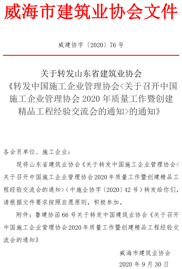 關(guān)于轉(zhuǎn)發(fā)山東省建筑業(yè)協(xié)會 《轉(zhuǎn)發(fā)中國施工企業(yè)管理協(xié)會<關(guān)于召開中國施工企業(yè)管理協(xié)會2020年質(zhì)量工作暨創(chuàng)建精品工程經(jīng)驗交流會的通知>的通知》