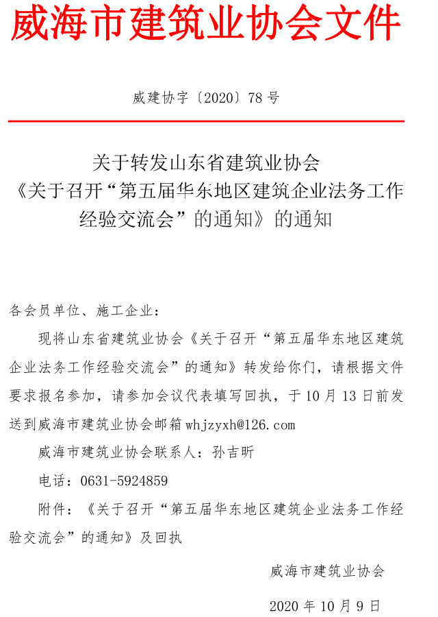 關(guān)于轉(zhuǎn)發(fā)山東省建筑業(yè)協(xié)會 《關(guān)于召開“第五屆華東地區(qū)建筑企業(yè)法務(wù)工作經(jīng)驗交流會”的通知》的通知