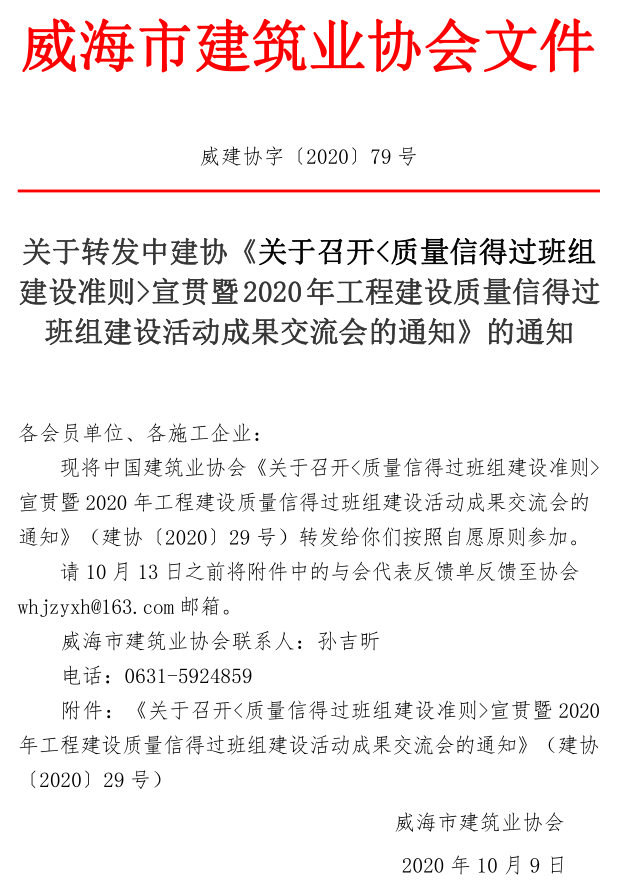 關(guān)于轉(zhuǎn)發(fā)中建協(xié)《關(guān)于召開<質(zhì)量信得過班組建設(shè)準(zhǔn)則>宣貫暨2020年工程建設(shè)質(zhì)量信得過班組建設(shè)活動成果交流會的通知》的通知