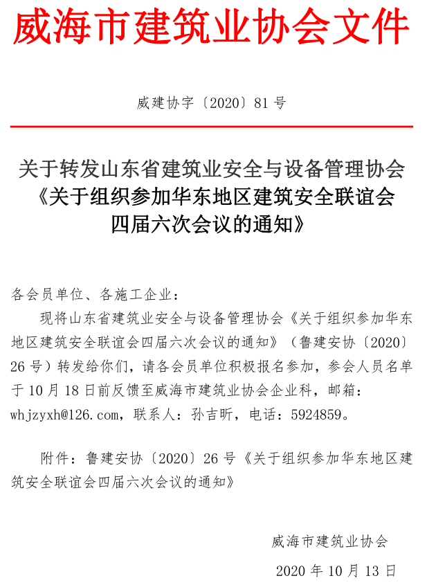 關(guān)于轉(zhuǎn)發(fā)山東省建筑業(yè)安全與設(shè)備管理協(xié)會(huì)《關(guān)于組織參加華東地區(qū)建筑安全聯(lián)誼會(huì)四屆六次會(huì)議的通知》
