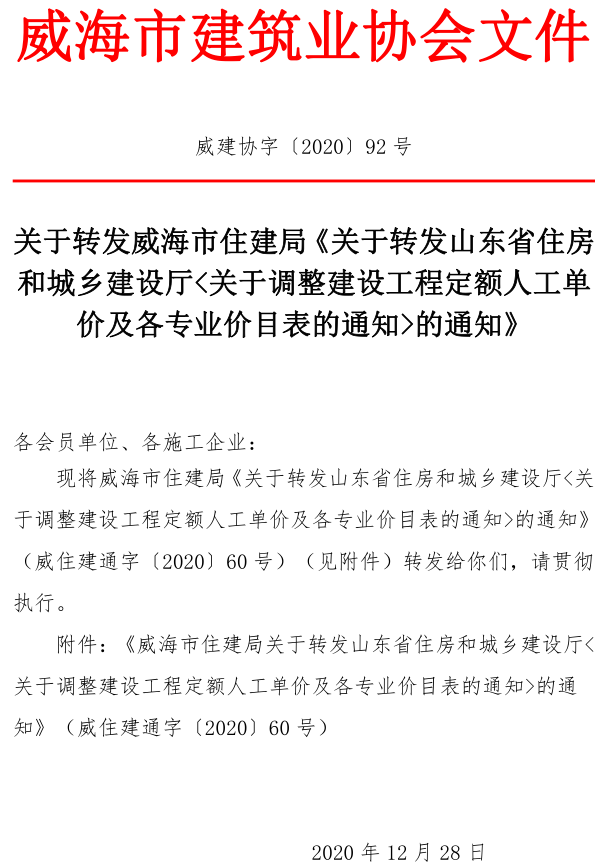 關(guān)于轉(zhuǎn)發(fā)威海市住建局《關(guān)于轉(zhuǎn)發(fā)山東省住房和城鄉(xiāng)建設(shè)廳<關(guān)于調(diào)整建設(shè)工程定額人工單價(jià)及各專(zhuān)業(yè)價(jià)目表的通知>的通知》