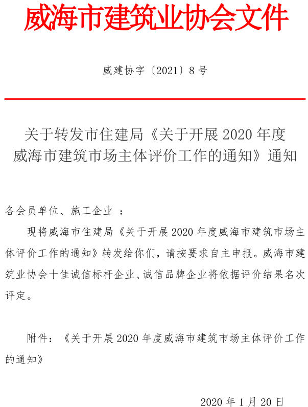 >關(guān)于轉(zhuǎn)發(fā)市住建局《關(guān)于開展2020年度 威海市建筑市場(chǎng)主體評(píng)價(jià)工作的通知》通知