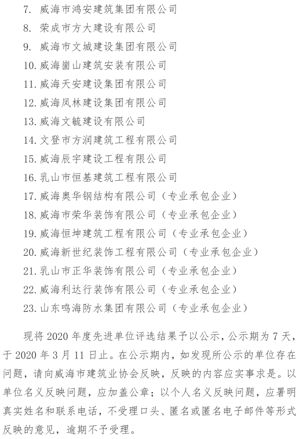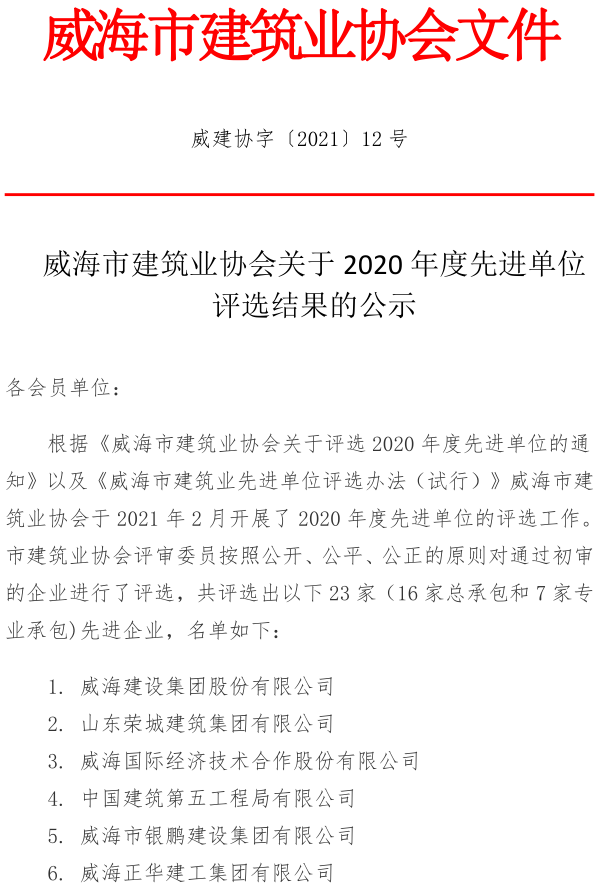 威海市建筑業(yè)協(xié)會關(guān)于2020年度先進(jìn)單位評選結(jié)果的公示