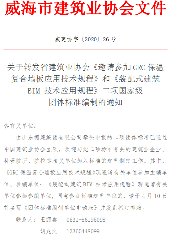 • 當(dāng)前位置:首頁(yè) >文件公告> 關(guān)于轉(zhuǎn)發(fā)省建筑業(yè)協(xié)會(huì)《邀請(qǐng)參加GRC保溫 復(fù)合墻板應(yīng)用技術(shù)規(guī)程》和《裝配式建筑 BIM 技術(shù)應(yīng)用規(guī)程》二項(xiàng)國(guó)家團(tuán)體標(biāo)準(zhǔn)編制的通知