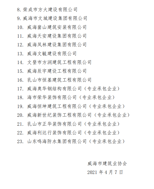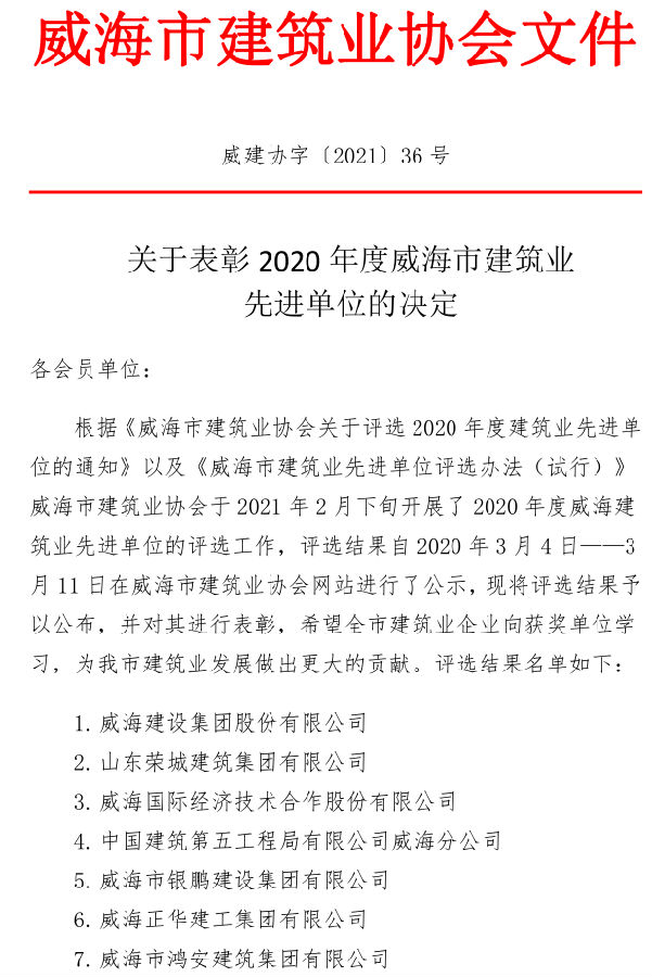關(guān)于表彰2020年度威海市建筑業(yè)先進單位的決定