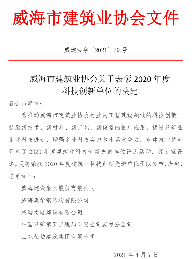 >威海市建筑業(yè)協(xié)會(huì)關(guān)于表彰2020年度 科技創(chuàng)新單位的決定