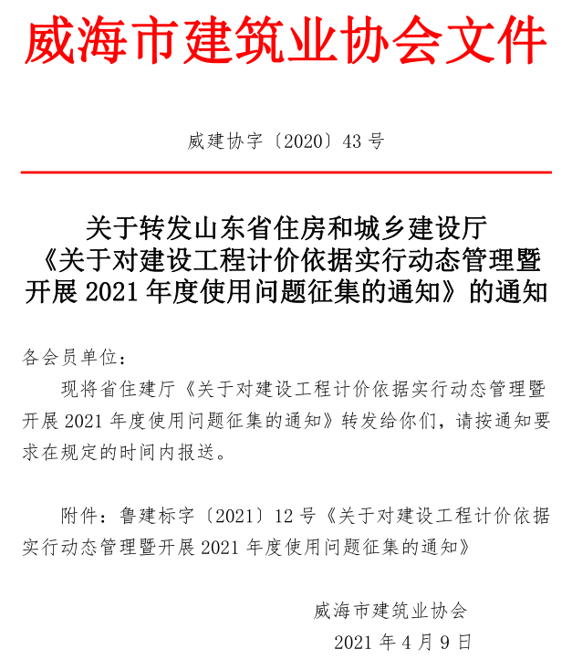 >關(guān)于轉(zhuǎn)發(fā)山東省住房和城鄉(xiāng)建設廳 《關(guān)于對建設工程計價依據(jù)實行動態(tài)管理暨開展2021年度使用問題征集的通知》的通知