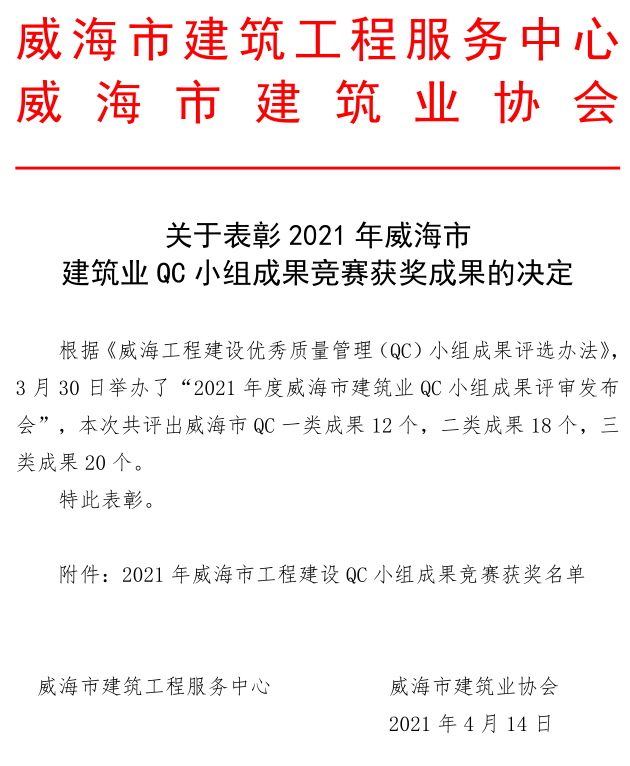 關于表彰2021年威海市 建筑業(yè)QC小組成果競賽獲獎成果的決定