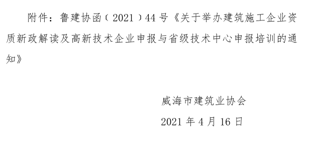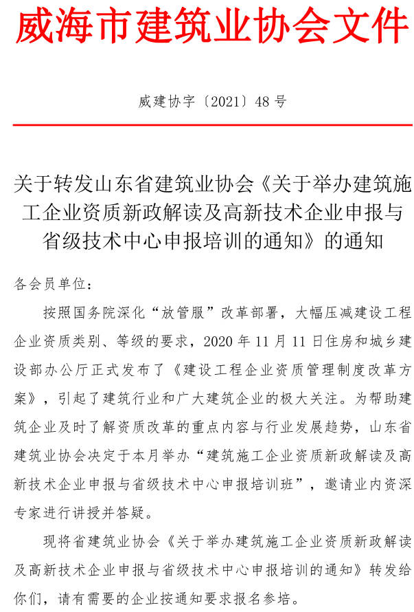 關(guān)于轉(zhuǎn)發(fā)山東省建筑業(yè)協(xié)會《關(guān)于舉辦建筑施工企業(yè)資質(zhì)新政解讀及高新技術(shù)企業(yè)申報(bào)與省級技術(shù)中心申報(bào)培訓(xùn)的通知》的通知