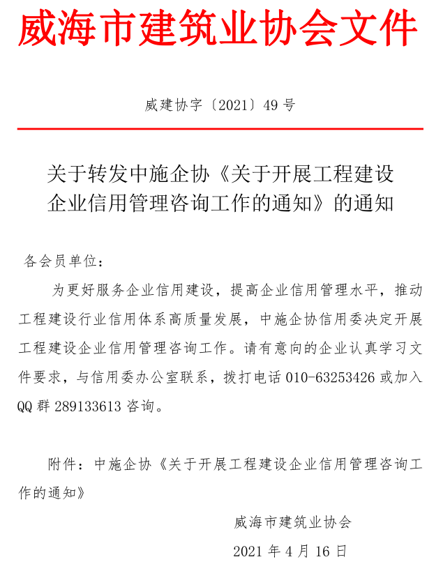 關(guān)于轉(zhuǎn)發(fā)中施企協(xié)《關(guān)于開展工程建設(shè) 企業(yè)信用管理咨詢工作的通知》的通知?