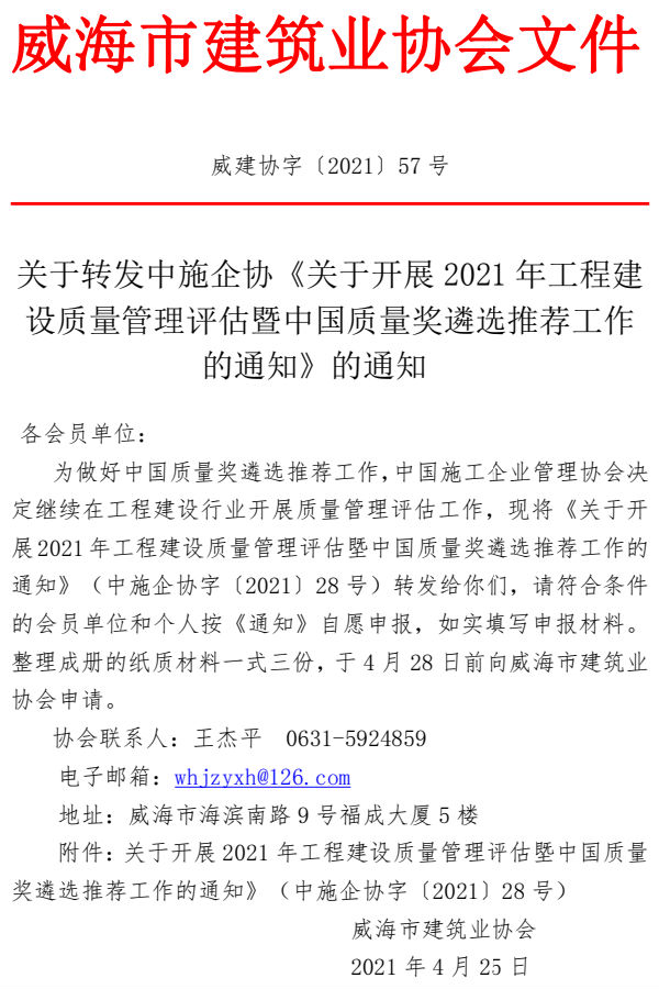 ? 關于轉(zhuǎn)發(fā)中施企協(xié)《關于開展2021年工程建設質(zhì)量管理評估暨中國質(zhì)量獎遴選推薦工作的通知》的通知