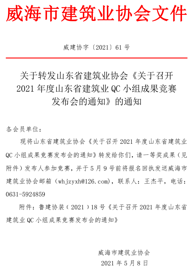 >關(guān)于轉(zhuǎn)發(fā)山東省建筑業(yè)協(xié)會《關(guān)于召開 2021年度山東省建筑業(yè)QC小組成果競賽 發(fā)布會的通知》的通知