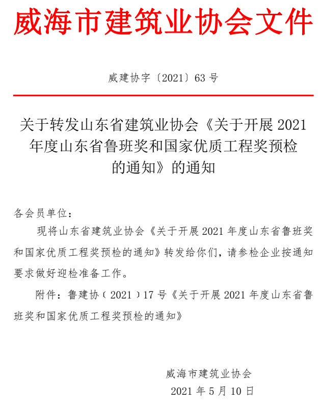 關(guān)于轉(zhuǎn)發(fā)山東省建筑業(yè)協(xié)會(huì)《關(guān)于開展2021年度山東省魯班獎(jiǎng)和國(guó)家優(yōu)質(zhì)工程獎(jiǎng)?lì)A(yù)檢的通知》的通知