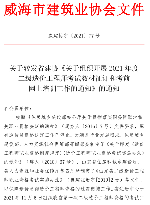 - 當(dāng)前位置:首頁 >文件公告>關(guān)于轉(zhuǎn)發(fā)省建協(xié)《關(guān)于組織開展2021年度 二級(jí)造價(jià)工程師考試教材征訂和考前 網(wǎng)上培訓(xùn)工作的通知》的通知