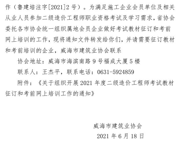 關(guān)于轉(zhuǎn)發(fā)省建協(xié)《關(guān)于組織開展2021年度 二級(jí)造價(jià)工程師考試教材征訂和考前 網(wǎng)上培訓(xùn)工作的通知》的通知