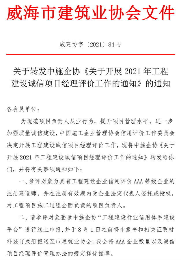 關(guān)于轉(zhuǎn)發(fā)中施企協(xié)《關(guān)于開展2021年工程 建設(shè)誠信項目經(jīng)理評價工作的通知》的通知