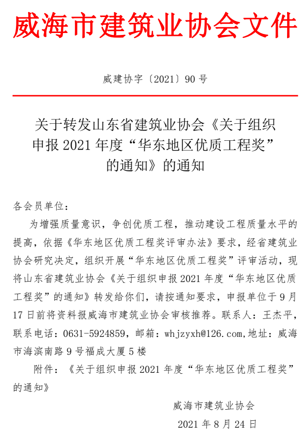 • 當(dāng)前位置:首頁 >文件公告>關(guān)于轉(zhuǎn)發(fā)山東省建筑業(yè)協(xié)會《關(guān)于組織 申報(bào)2021年度“華東地區(qū)優(yōu)質(zhì)工程獎” 的通知》的通知