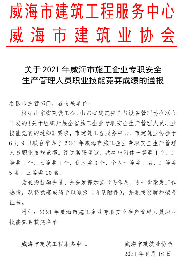 >關(guān)于2021年威海市施工企業(yè)專職安全 生產(chǎn)管理人員職業(yè)技能競賽成績的通報