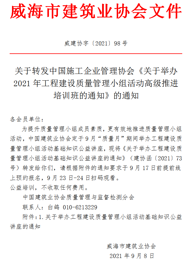 關(guān)于轉(zhuǎn)發(fā)中國施工企業(yè)管理協(xié)會(huì)《關(guān)于舉辦2021年工程建設(shè)質(zhì)量管理小組活動(dòng)高級(jí)推進(jìn)培訓(xùn)班的通知》的通知