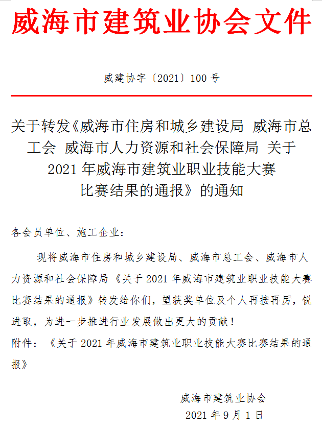 關(guān)于轉(zhuǎn)發(fā)《威海市住房和城鄉(xiāng)建設(shè)局 威海市總工會 威海市人力資源和社會保障局 關(guān)于2021年威海市建筑業(yè)職業(yè)技能大賽 比賽結(jié)果的通報(bào)》的通知