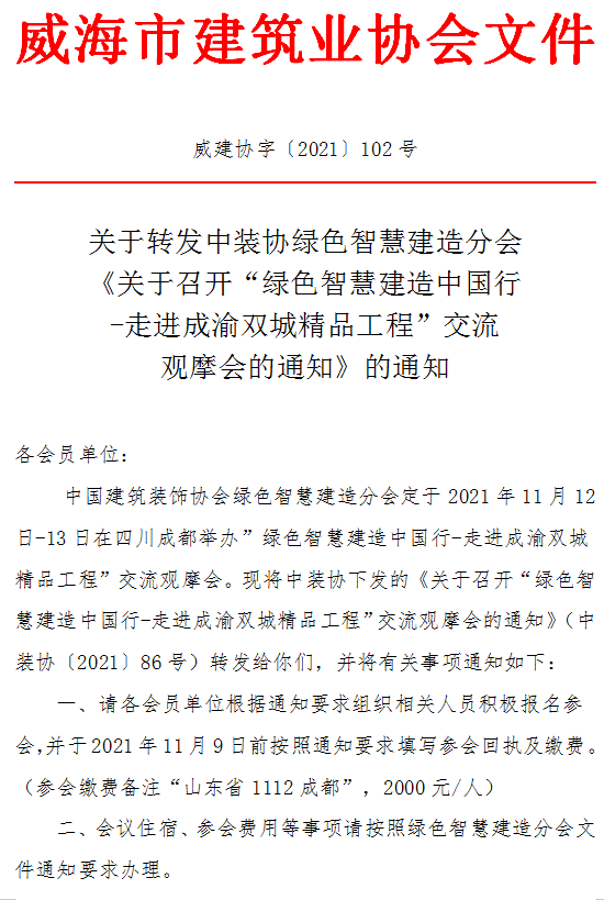 >關(guān)于轉(zhuǎn)發(fā)中裝協(xié)綠色智慧建造分會《關(guān)于召開“綠色智慧建造中國行-走進(jìn)成渝雙城精品工程”交流觀摩會的通知》的通知
