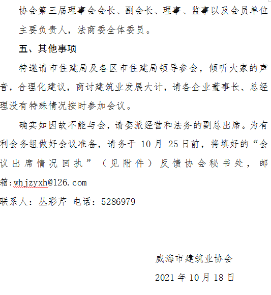 關(guān)于召開威海市建筑業(yè)協(xié)會(huì)第三屆理事會(huì)第三次會(huì)議暨?三屆二次會(huì)長(zhǎng)辦公會(huì)、法商委第二次會(huì)議通知
