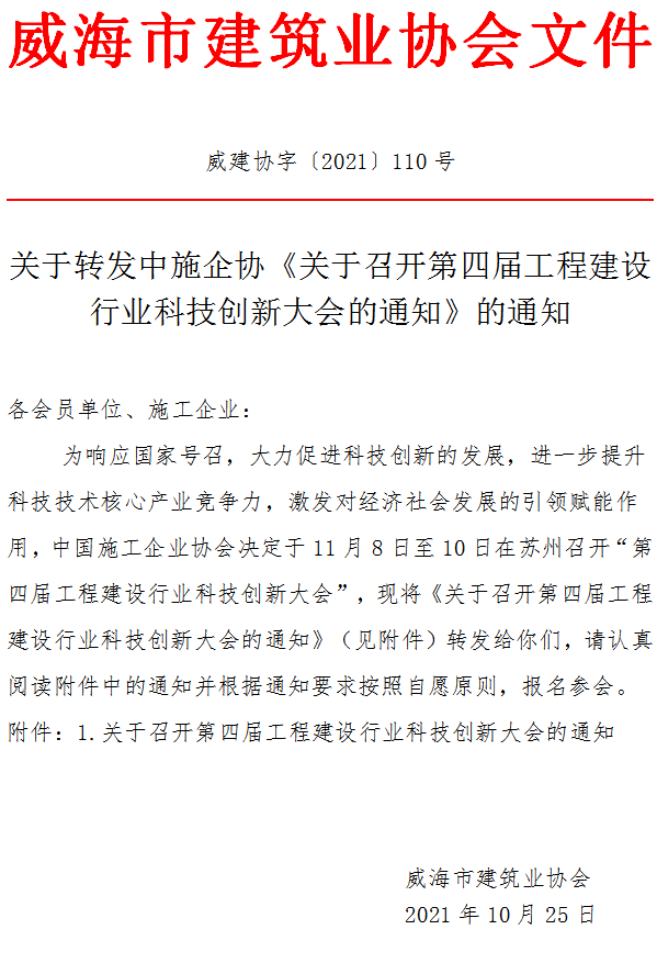 關(guān)于轉(zhuǎn)發(fā)中施企協(xié)《關(guān)于召開第四屆工程建設(shè)行業(yè)科技創(chuàng)新大會的通知》的通知