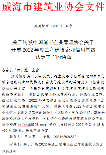 >關(guān)于轉(zhuǎn)發(fā)中國施工企業(yè)管理協(xié)會關(guān)于開展2022年度工程建設(shè)企業(yè)信用星級認定工作的通知