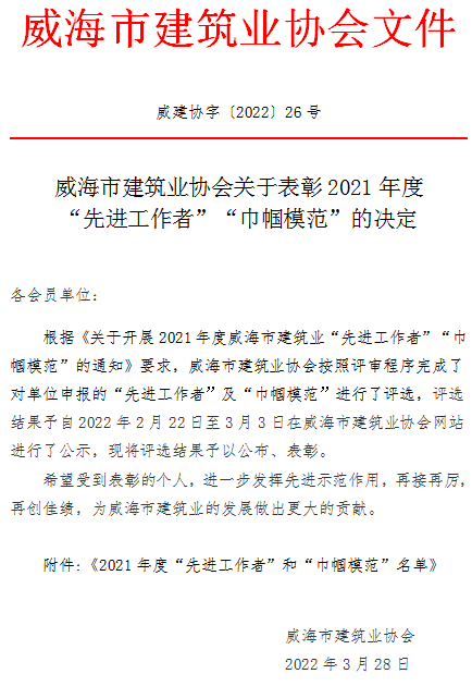 >威海市建筑業(yè)協(xié)會關于表彰2021年度“先進工作者”“巾幗模范”的決定