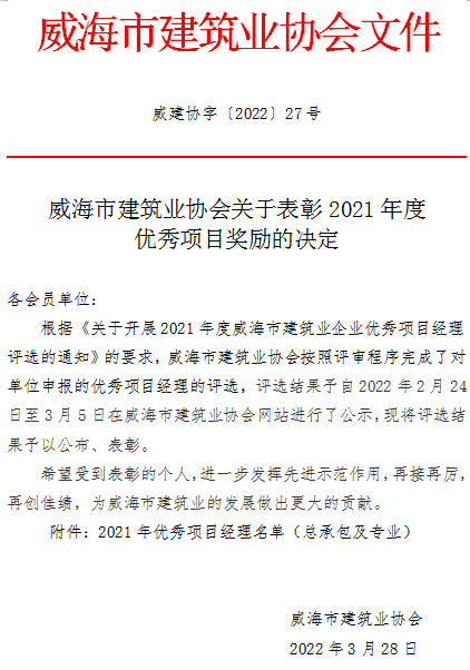 >威海市建筑業(yè)協(xié)會(huì)關(guān)于表彰2021年度優(yōu)秀項(xiàng)目經(jīng)理的決定