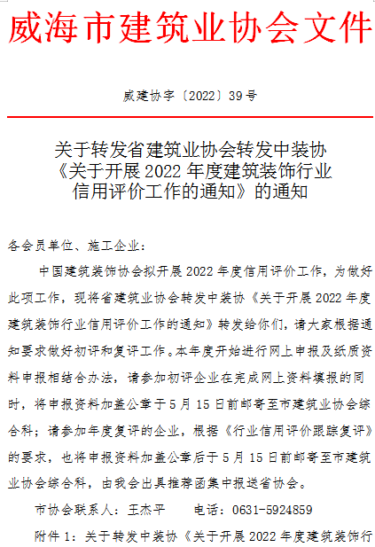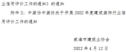 關(guān)于轉(zhuǎn)發(fā)省建筑業(yè)協(xié)會(huì)轉(zhuǎn)發(fā)中裝協(xié)《關(guān)于開展2022年度建筑裝飾行業(yè)信用評價(jià)工作的通知》的通知