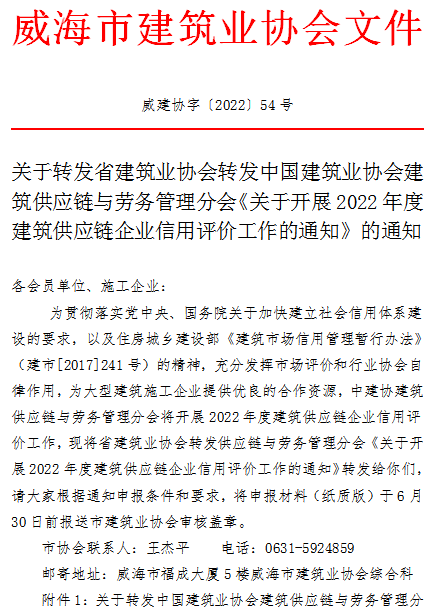 關(guān)于轉(zhuǎn)發(fā)省建筑業(yè)協(xié)會轉(zhuǎn)發(fā)中國建筑業(yè)協(xié)會建筑供應(yīng)鏈與勞務(wù)管理分會《關(guān)于開展2022年度建筑供應(yīng)鏈企業(yè)信用評價工作的通知》的通知