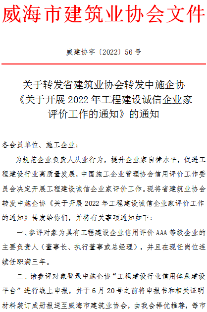 >關于轉發(fā)省建筑業(yè)協(xié)會轉發(fā)中施企協(xié)《關于開展2022年工程建設誠信企業(yè)家評價工作的通知》的通知