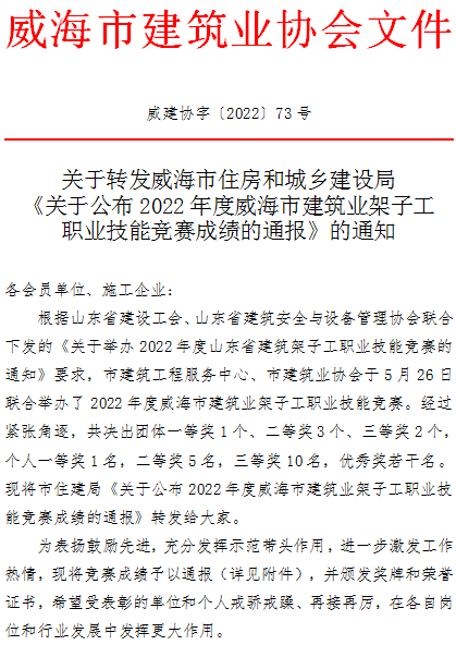 關于轉(zhuǎn)發(fā)威海市住房和城鄉(xiāng)建設局《關于公布2022年度威海市建筑業(yè)架子工職業(yè)技能競賽成績的通報》的通知