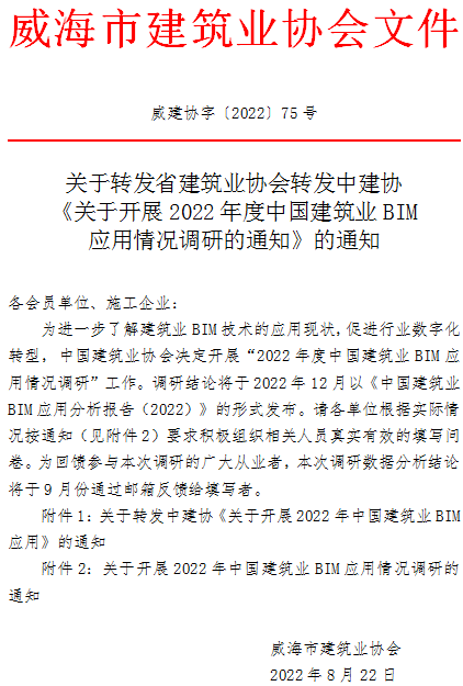 關(guān)于轉(zhuǎn)發(fā)省建筑業(yè)協(xié)會(huì)轉(zhuǎn)發(fā)中建協(xié)《關(guān)于開展2022年度中國(guó)建筑業(yè)BIM應(yīng)用情況調(diào)研的通知》的通知