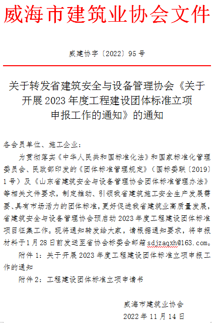 >關(guān)于轉(zhuǎn)發(fā)省建筑安全與設(shè)備管理協(xié)會《關(guān)于開展2023年度工程建設(shè)團體標準立項申報工作的通知》的通知