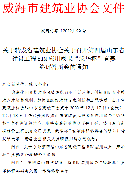 關(guān)于轉(zhuǎn)發(fā)省建筑業(yè)協(xié)會(huì)召開第四屆山東省建設(shè)工程BIM應(yīng)用成果“榮華杯”競(jìng)賽終評(píng)答辯會(huì)的通知