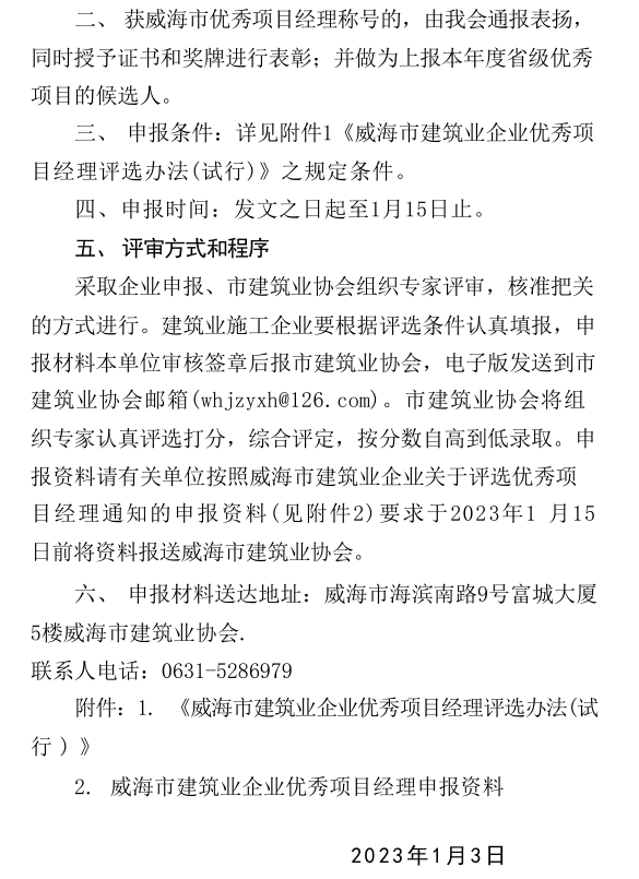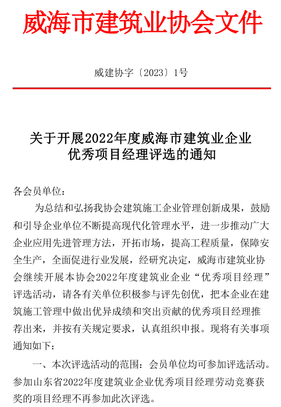>關(guān)于開展2022年度威海市建筑業(yè)企業(yè)優(yōu)秀項(xiàng)目經(jīng)理評選的通知