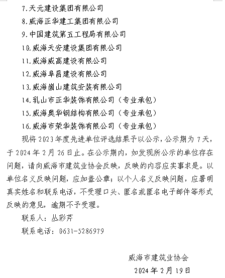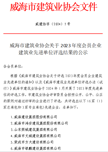 >威建協(xié)字2024年7號威海市建筑業(yè)協(xié)會關(guān)于2023年度先進單位評選結(jié)果的公示