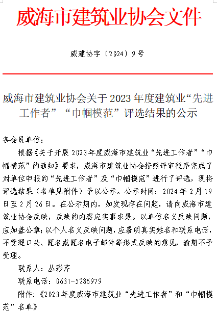 >威建協(xié)字2024年9號威海市建筑業(yè)協(xié)會關(guān)于對2023年度“先進(jìn)工作者”“巾幗模范”評選結(jié)果的公示