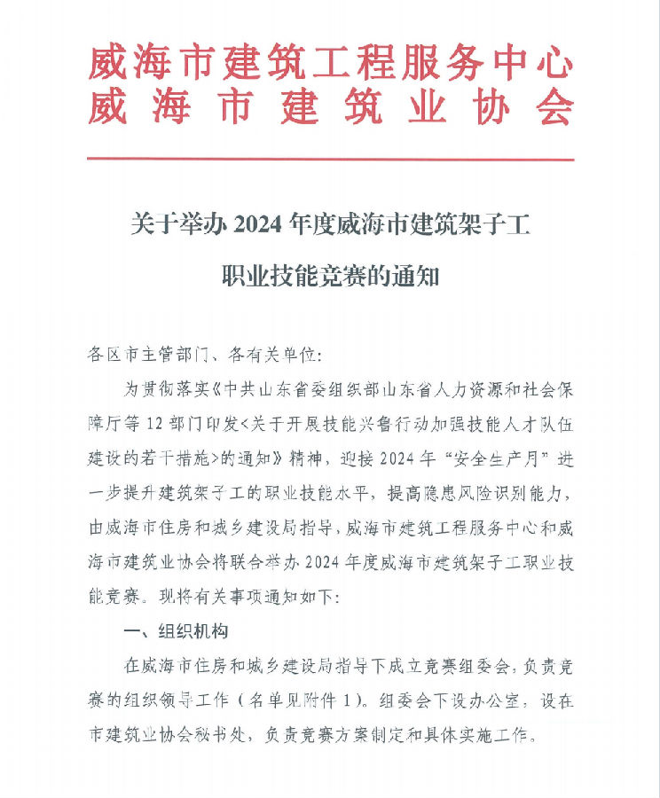 關(guān)于舉辦2024年度威海市建筑架子工職業(yè)技能競賽的通知